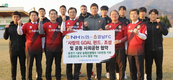 NH농협은행 경남본부는 지난 20일 남해스포츠파크를 찾아 경남FC 선수단을 격려하고, 경남FC와 사랑의 골 적립펀드 조성 및 공동 사회공헌 협약식을 가졌다고 밝혔다.