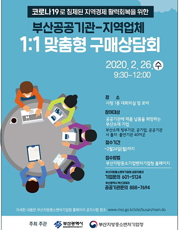 부산시와 부산지방중소벤처기업청(부산중기청)이 오는 26일 오전 9시 30분 시청 1층 대회의실에서 ‘부산 공공기관 지역 제품 합동구매 상담회’를 개최한다고 21일 밝혔다.