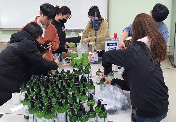 '신종 코로나바이러스(코로나19)' 사태로 비상 상황이 지속되고 있는 가운데 경상대학교 약학대학 학생들이 자체 활동 수익금으로 손소독제를 제작, 교직원과 학생들에게 나눠줌으로써 코로나19 감염 예방에 큰 도움이 돼 눈길을 끌고 있다.