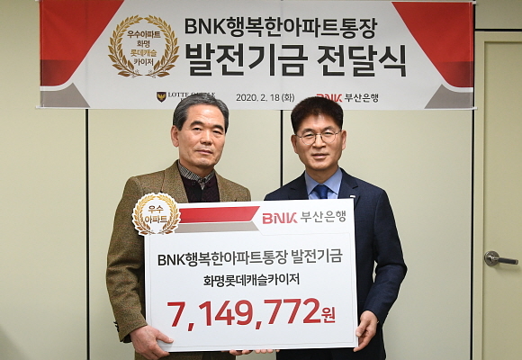 한편 부산은행은 지난 18일 발전기금 전달 대상 아파트를 대표해 화명롯데캐슬카이저 아파트 관리사무소에 700만원 상당의 발전기금을 직접 전달했다.