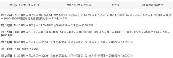 표 상위 목록 보는 법은 [환자 번호(나이, 성별, 거주지역), 감염 원인, 접촉자 수, 격리시설]입니다.