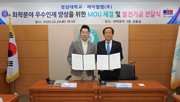 경상대학교는 제이엘켐(주)과 화학 분야 우수인재 양성과 상호 발전적인 지원체계 구축을 위해 상호협력 협약(MOU)을 체결했다. 또한 제이엘켐은 경상대에 발전기금 2000만 원을 출연했다.