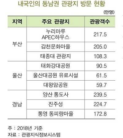 동남권에는 해운대 누리마루 APEC 하우스, 감천문화마을, 양산 통도사, 진주성 등 연간 200만명 이상의 내국인이 방문하는 관광지가 다수 입지하고 있어 인근 음식점업, 숙박업 등이 1차적으로 큰 피해를 받고 있는 것으로 나타났다.