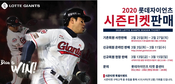 롯데 자이언츠는 이후 내달 13일부터 15일까지 3일 동안 매일 오전 11시부터 오후 5시까지 사직야구장 광장에 있는 자이언츠 라운지에서 시즌 티켓 현장판매를 진행한다.