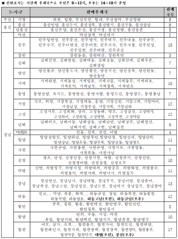 부산·울산·경남 판매지역은 고령자 등 마스크 공급여건이 취약한 읍·면 소재 204개 우체국에서 판매한다.