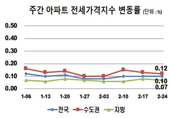 2월 4주차 아파트 전세가는 전주대비 0.10% 상승하며 지난주 상승폭을 유지했다. 수도권은 상승폭이 3주차 0.13%에서 4주차 0.12%로 축소했으며 서울은 그대로 0.04% 상승세를 유지했다.