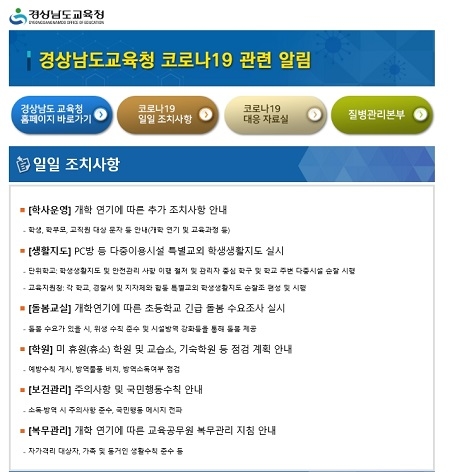 경남도교육청은 27일부터 자체 홈페이지에 '코로나19' 임시페이지를 설치해 코로나 관련 정보를 안내하고 있다고 밝혔다.