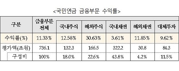 금융부문의 운용수익률은 11.33%로 각 자산군은 국내주식이 12.58%, 해외주식은 30.63%, 국내채권 3.61%, 해외채권 11.85%, 대체투자 자산은 9.62%의 수익률을 기록했다.
