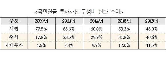 국민연금공단 자체 조사자료에 따르면 지난 10년 동안 채권투자 비중은 29.5%p 줄어들었으며 주식, 대체투자는 각각 22.8%p, 7.0%p 늘어난 것으로 파악됐다.