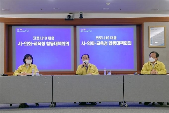 부산시의회와 시교육청, 부산시가 지난 2일 정부의 개학 추가 2주 연기 결정에 따른 지역사회 충격 최소화와 코로나19 감염증 확산방지를 위해 힘을 모은다.