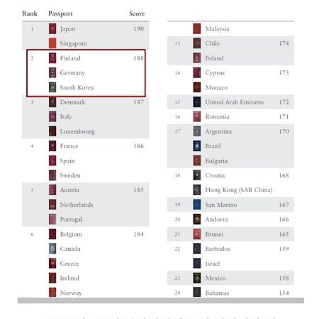 일본과 싱가포르는 비자 없이 여권만 있으면 190개국을 여행할 수 있는 것으로 집계됐다. 이어 2위에 오른 우리나라와 독일, 핀란드는 무비자로 입국 가능한 국가가 188개국으로 나타났다.