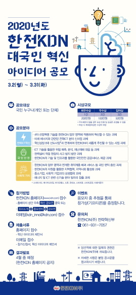 한전KDN은 이달 31일까지 ‘2020년도 한전KDN 대국민 혁신 아이디어 공모’를 시행하고 있다고 밝혔다. 이번 공모전은 국민 중심의 혁신 과제를 발굴해, 양방향 소동의 혁신 프로세스를 강화하기 위해 전 국민을 대상으로 실시한다.