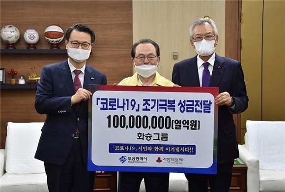 부산시는 지난 4일 오후 시청 7층 접견실에서 화승그룹, ㈜대한제강, 한국거래소(KRX)가 코로나19 극복을 위한 성금 각 1억원씩 총 3억원을 시에 전달했다고 5일 밝혔다.