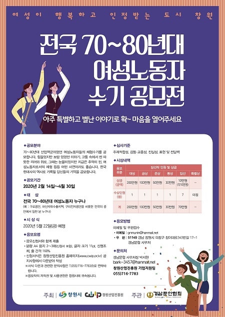 이번 공모전은 창원산업진흥원과 경남문인협회가 공동으로 진행하며, 70~80년대의 힘들었지만 보람 있었던 이야기, 그때는 눈물이었지만 지금은 추억이 된 한국여성노동자들의 체험담 등을 주제로 진행된다.