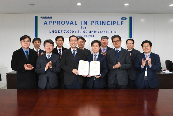 한국선급이 최근 현대중공업 사옥에서 현대중공업이 개발한 ‘LNG 이중 연료추진 자동차 운반선’에 대한 적합성을 검증하는 기본승인(AIP) 인증을 부여했다고 5일 밝혔다.