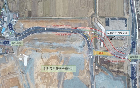 경남 창원시는 북면 동전리 일원 동전일반산업단지 조성공사에 따른 주민들의 교통불편을 해소하기 위해 동전사거리~동전교차간 우회가도를 확장 및 개선해 오는 10일 개통한다고 밝혔다.