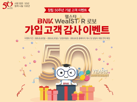 BNK경남은행은 창립 50주년을 기념해 오는 5월 말까지 ‘BNK웰스타로보 가입 고객 감사 이벤트’를 진행하고 있다고 밝혔다.