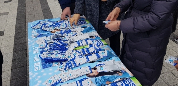 대선주조는 안전을 위해 직원이 물품을 건네는 방식이 아닌, 시민들이 직접 물품을 가져갈 수 있도록 간이 테이블을 설치해 손 소독제를 배치하고 있다.