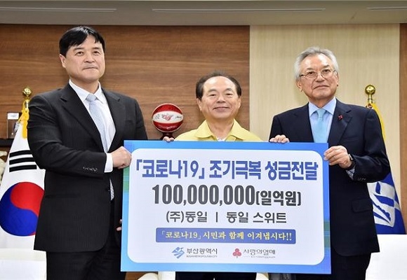 이날 열린 전달식에서 동일은 성금 1억원을, 무학은 1억원 상당의 살균 소독제 3만 4680개를, 부산불교사회복지협의회는 성금 1000만원을 시에 기탁했다.