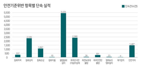 2019년 위반항목별 단속현황은 안전기준 위반 13,418건(90.6%), 불법튜닝 861건(5.8%), 등록번호판 등 위반 539건(3.6%)으로 조사됐다. 가장 많은 비중을 차지하고 있는 안전기준 위반 항목은 불법등화 설치 5,434건(40.5%), 후부반사판(지) 설치상태 불량 2,390건(17.8%) 순이다.