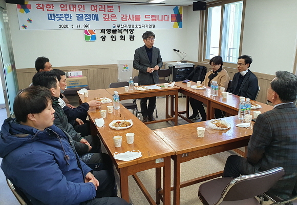 이날 김문환 부산중기청장은 시장 임대료 인하를 결정한 괴정골목시장 임대인들에 감사의 뜻을 전하고 시장 내 애로사항을 청취 후 시장 발전에 대해 논의했다.