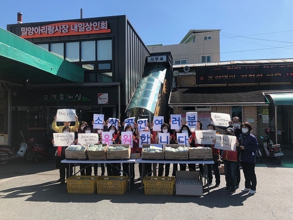 밀양시자원봉사센터는 코로나19로 힘든 소상공인들을 응원하기 위해 '힘내라, 밀양소상공인' 응원키트 1000개를 제작, 11일 관내 소상공인 점포를 방문해 전달했다.