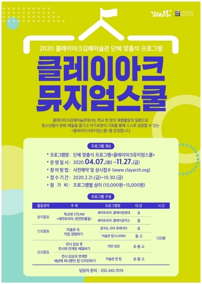 올해 운영되는 ‘2020클레이아크뮤지엄스쿨’은 고객 맞춤식 프로그램으로 참가자의 연령, 난이도, 인원 등 기관의 성격에 따라 선택할 수 있는 6가지 프로그램이 준비돼 있다.