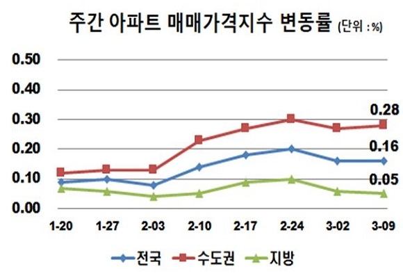 한국감정원이 올해 3월 둘째 주 전국 주간 아파트 가격 동향을 조사한 결과를 12일 발표했다. 이에 따르면 매매가는 전주대비 0.16% 상승했으며 전세가는 0.07% 상승했다.