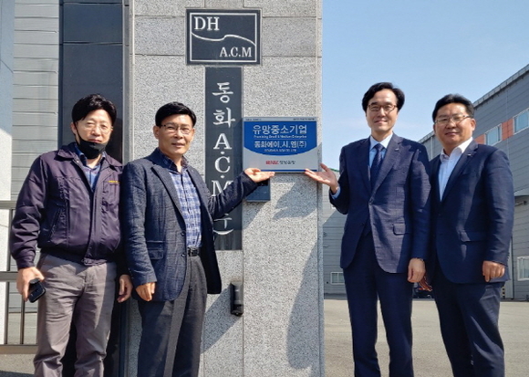 한편 이날 예경탁 상무는 김해시 진영읍에 소재한 동화에이시엠을 방문해 김한기 대표에게 유망중소기업 인증서와 현판을 전달했다.