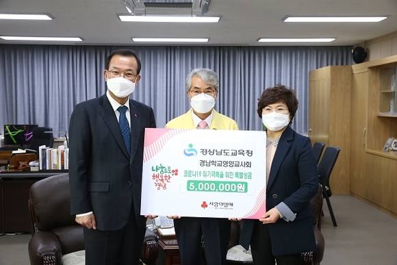 경남도교육청은 12일 코로나19로 인해 현장에서 애쓰는 의료계에 사용해 달라며 경남학교영양교사회가 모금한 500만 원을 사회복지공동모금회에 성금으로 기탁했다.