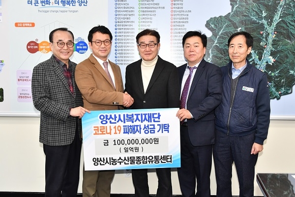 양산시 농수산물종합유통센터가 지난 11일 코로나19 극복에 써 달라며 양산시에 지역발전기금 1억원을 기탁했다. 농수산물종합유통센터 관계자는 “코로나19로 시민들이 많은 어려움을 겪고 있는 시점으로 나눔에 참여하게 됐다”며 “코로나19 상황이 조속히 진정되어 활기찬 양산시가 되기를 바란다”고 말했다. 한편 이날 기금은 (재)양산시복지재단으로 전달돼 코로나19 관련 지역사회 재난 대응과 나눔 운동을 진행하는 데에 쓰일 예정이다.
