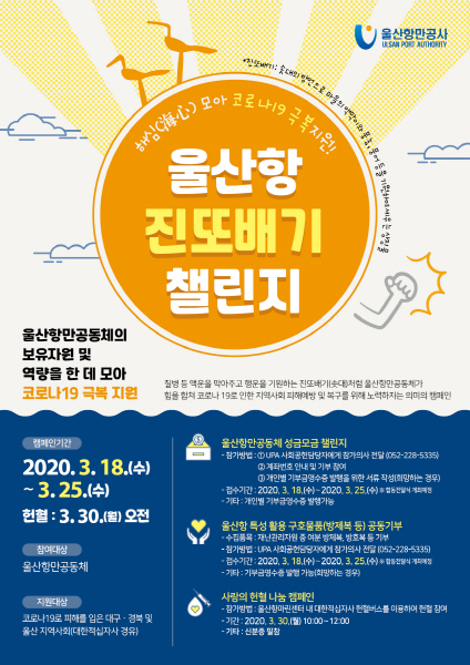 울산항만공사(이하 UPA)는 오는 18일부터 25일까지 코로나19 피해복구 지원을 위한 ‘해심(海心) 모아 코로나19 극복지원! 울산항 진또배기 챌린지’ 캠페인에 함께 참여할 울산항만공동체(기업/개인)를 모집한다고 17일 밝혔다.