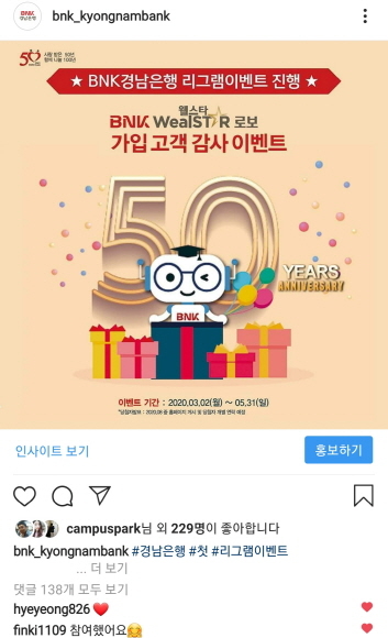 BNK경남은행은 오는 5월 말까지 ‘BNK웰스타로보(WealSTARRobo) 리그램 이벤트’를 진행하고 있다.