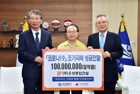 우성종합건설은 어려운 건설경기에도 불구하고 코로나19의 조기 종식을 응원하는 의미에서 1억원의 성금을 기부했다. 부산국세청도 직원들이 자발적으로 모은 성금 950만원을 코로나19로 고통받는 시민들을 위해 전달했다.