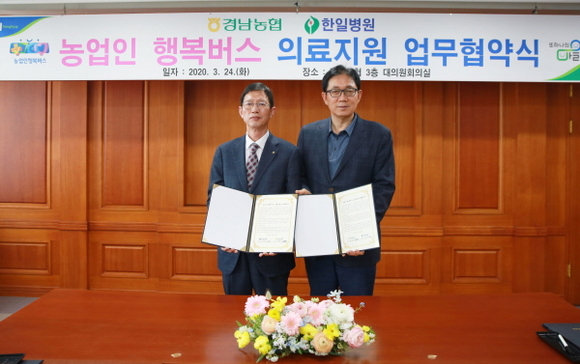 경남농협은 24일 경남농협 회의실에서 진주 한일병원과 ‘농업인 행복버스 의료지원 업무협약’을 체결하고, 의료여건이 열악한 농업인을 위한 현장 의료지원 활동을 진행하기로 했다고 밝혔다.
