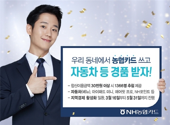 이용금액 30만원 당 이벤트 응모권 1장이 부여되고 최대 10장까지 발급된다. 추첨을 통해 총 1336명에게 1등 자동차(베뉴 스마트스트림, 1명), 2등 아이패드 미니(10명), 3등 에어팟 프로(25명), 4등 NH포인트 5만원(100명), 5등 NH포인트 3만원(200명), 6등 NH포인트 1만원(1,000명) 등 푸짐한 경품을 제공한다. 이벤트 응모는 농협카드 홈페이지 또는 농협카드 앱에서 참여할 수 있다.