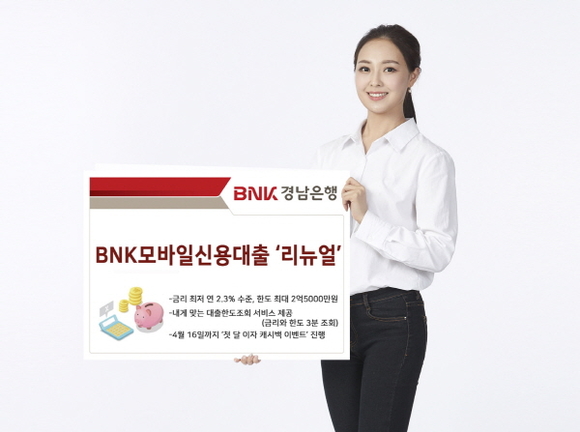 한편 경남은행은 BNK모바일신용대출 리뉴얼을 기념해 내달 16일까지 ‘BNK모바일신용대출 첫 달 이자 캐시백 이벤트’를 진행하고 있다.