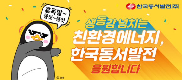 한국동서발전은 신재생에너지에 대한 국민의 관심을 높이기 위해 EBS 연습생 펭수와 손잡고 옥외광고, SNS 등 다양한 경로를 통해 친환경 홍보콘텐츠를 제공한다고 25일 밝혔다.