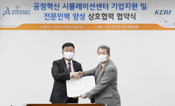 한국전기연구원(KERI)은 세계적인 소프트웨어 기업인 다쏘시스템코리아㈜와 ‘공정 혁신 시뮬레이션 센터’ 구축 추진을 위한 양해각서(MoU)를 체결했다. 체결식은 25일 양 기관 대표자가 참석한 가운데 연구원 창원본원에서 열렸다.