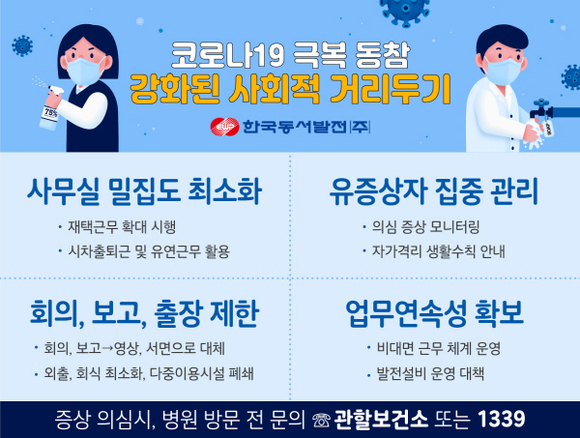 한국동서발전은 코로나19 확산 억제를 위해 4월 5일까지 사회적 거리두기 강화 기간 동안 공무원 복무관리 특별지침을 반영한 코로나19 대응강화 방안을 시행한다고 밝혔다.