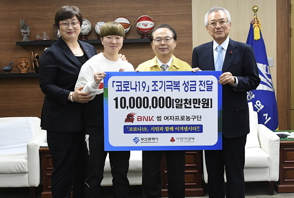 BNK썸 여자프로농구단이 코로나19 감염증 극복 지원을 위한 성금 1000만원을 부산시에 기부했다고 26일 밝혔다.