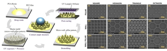 조영태 교수 연구팀은 특수한 코팅 없이 마이크로 패턴구조만 이용해 초발수성을 가질 수 있는 최적의 패턴 모양을 제안했다. 마이크로 구조물의 패턴 및 형상이 표면에 미치는 영향을 분석하기 위해 초발수성을 가질 수 있는 다양한 구조를 설계했으며, 나노 임프린트 리소그래피라는 패턴 복제 방법을 적용해 마이크로 패턴을 제작했다.