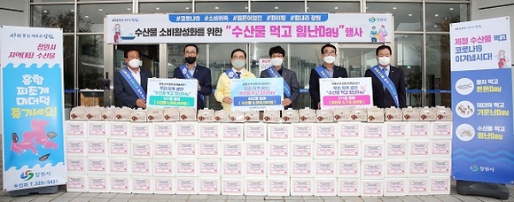 경남 창원시는 지난 27일 시청 본관 입구에서 어업현장의 일선에서 일하는 어업인들을 돕기 위해 직원들을 대상으로 '수산물 먹고 힘난 데이(Day) 행사'를 추진, 783개(840만원 상당)의 수산물을 판매했다.