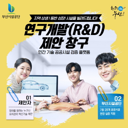 부산시설공단이 내달 1일부터 공단에서 관리하고 있는 도시기반시설 28곳을 대상으로 연구개발(R&D) 제안창구를 운영한다고 31일 밝혔다.