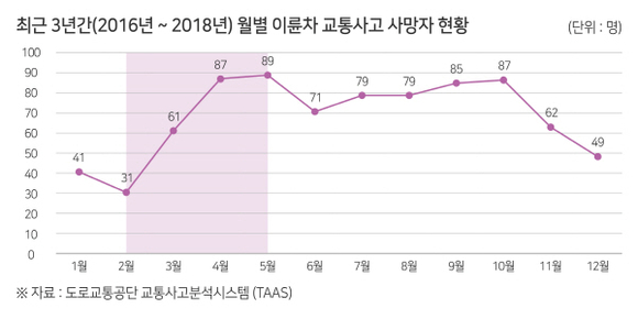 월별로 이륜차 교통사고 사망자 현황을 살펴보면 3월부터 크게 증가해 5월에 가장 많이 발생하고, 10월까지 지속되는 것으로 나타났다.