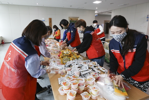 벡스코 직원들이 1일 코로나19 감염병 사태를 함께 극복하기 위해 부산시자원봉사센터를 방문해 후원물품 포장 봉사를 진행하고 있다.
