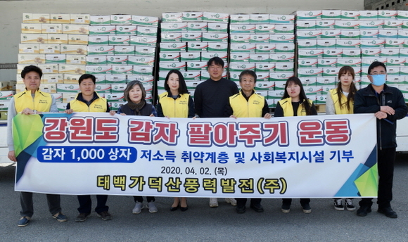 태백가덕산풍력발전은 코로나19 사태의 장기화로 농산물 판로 마련에 어려움을 겪고 있는 강원도 농민을 지원하기 위해 1천만원 상당의 감자를 구매했다. 이날 구매한 감자는 강원도 태백시 사회복지과 등을 통해 사회복지시설 및 저소득층 등 취약계층에 전달될 예정이다.