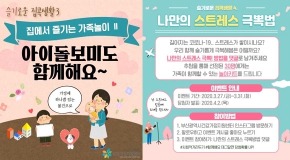 먼저 누구나 손쉽게 활용할 수 있도록 가정에서 자녀와 함께하는 가족놀이, 가정원예, 장시간 실내 생활에 따른 스트레스 해소법 등 '슬기로운 집콕 생활'에 대한정보를 제공한다. 이는 부산시 건강가정지원센터 홈페이지에서 확인할 수 있다.