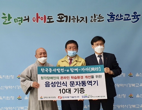 동서발전은 7일 울산 강북교육지원청(울산 북구 소재)에서 실시간 문자통역이 가능한 ‘소보로 탭’ 10대(900만원 상당)를 전달했다. 기기는 강북 교육지원청이 선발한 청각장애인 학생에게 대여, 지원될 예정이다.
