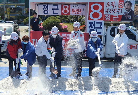 정근 후보가 8일 오전 11시 부산시 초읍동 어린이대공원에서 지하철 개통을 유권자들에 약속하는 ‘희망 지하철 기공식’ 행사를 연 가운데 캠프 관계자들과 삽을 뜨는 퍼포먼스를 하고 있다.